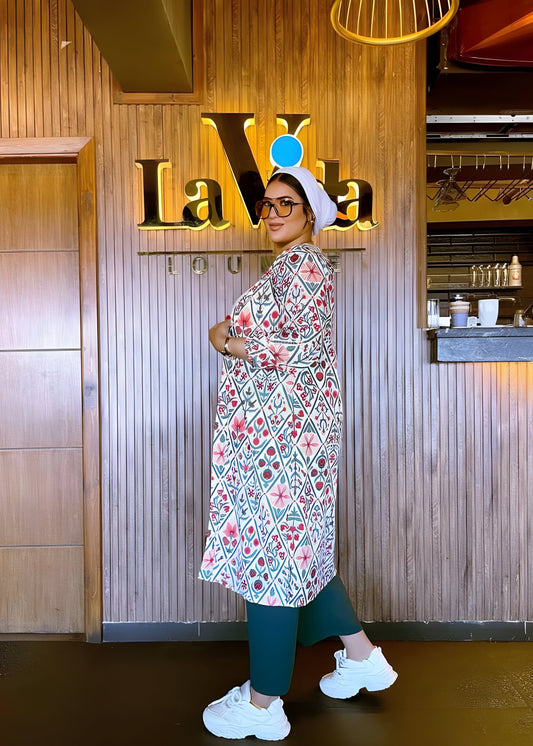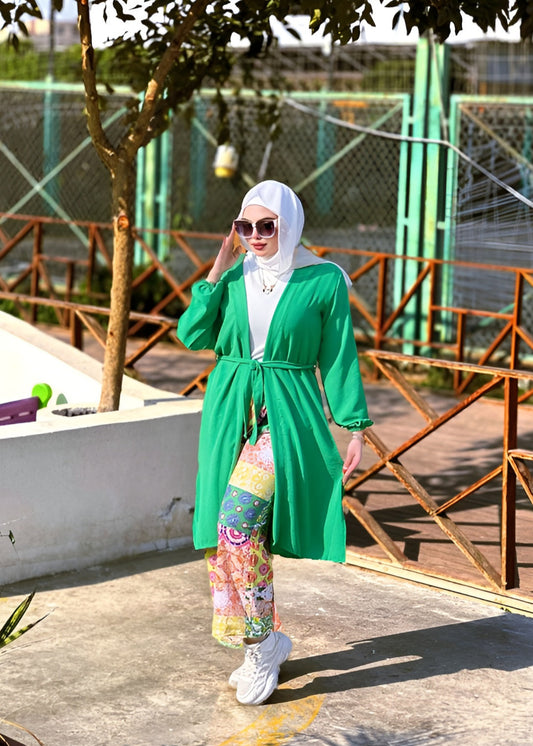 Green Open Cardigan with Printed Pants